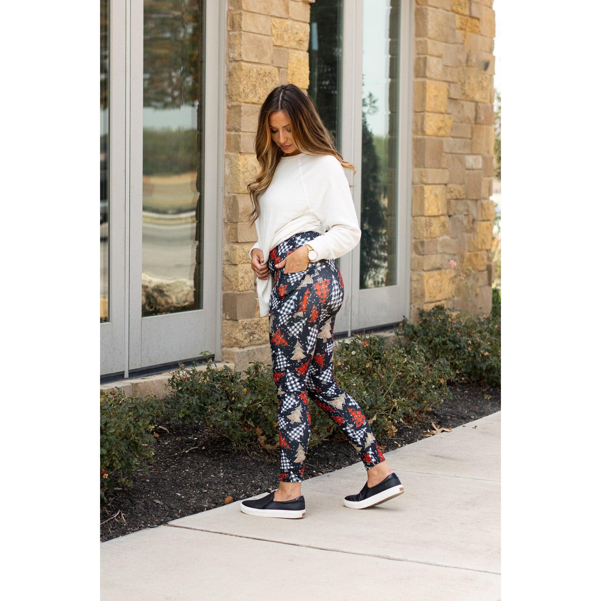 Featuring functional side pockets, a high waistband for a flattering fit, and a vibrant Christmas tree print — they’re perfect for pairing with oversized sweaters, hoodies, or your favorite Julia Rose shackets.